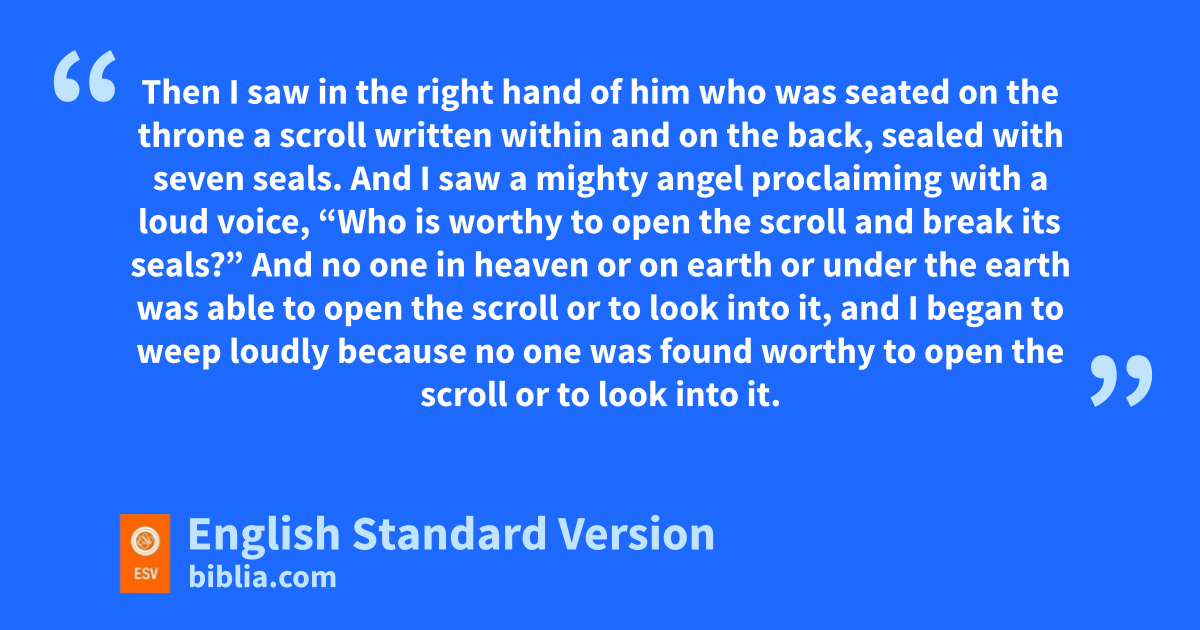 5 Then I saw in the right hand of him who was seated on the throne ha scroll written within and on the back, isealed with seven seals. 2 And jI saw a mighty angel proclaiming with a loud voice, “Who is worthy to open the scroll and break its seals?” 3 And no one in heaven or on earth or under the earth was able to open the scroll or to look into it, 4 and I began to weep loudly because no one was found worthy to open the scroll or to look into it. 5 And one of the elders said to me, “Weep no more; behold, kthe Lion lof the tribe of Judah, mthe Root of David, has conquered, so that he can open the scroll and its seven seals.”