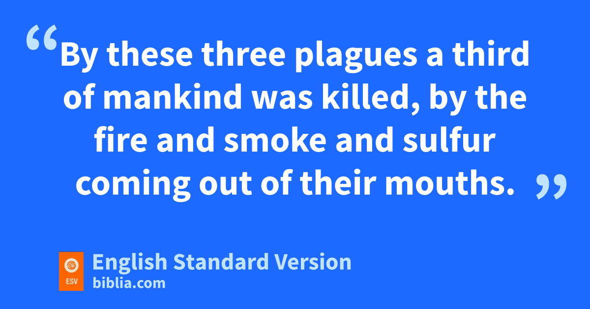 13 Then the sixth angel blew his trumpet, and I heard a voice from lthe four horns of the golden altar before God, 14 saying to the sixth angel who had the trumpet, “Release mthe four angels who are bound at nthe great river Euphrates.” 15 So the four angels, who had been prepared for the hour, the day, the month, and the year, were released oto kill a third of mankind. 16 The number of pmounted troops was qtwice ten thousand times ten thousand; rI heard their number. 17 And this is how I saw the horses in my vision and those who rode them: they wore breastplates the color of fire and of sapphire3 and of sulfur, and the heads of the horses were slike lions’ heads, and fire and smoke and sulfur came out of their mouths. 18 By these three plagues a third of mankind was killed, by the fire and smoke and sulfur coming out of their mouths. 19 For the power of the horses is in their mouths and in their tails, for their tails are like serpents with heads, and by means of them they wound.