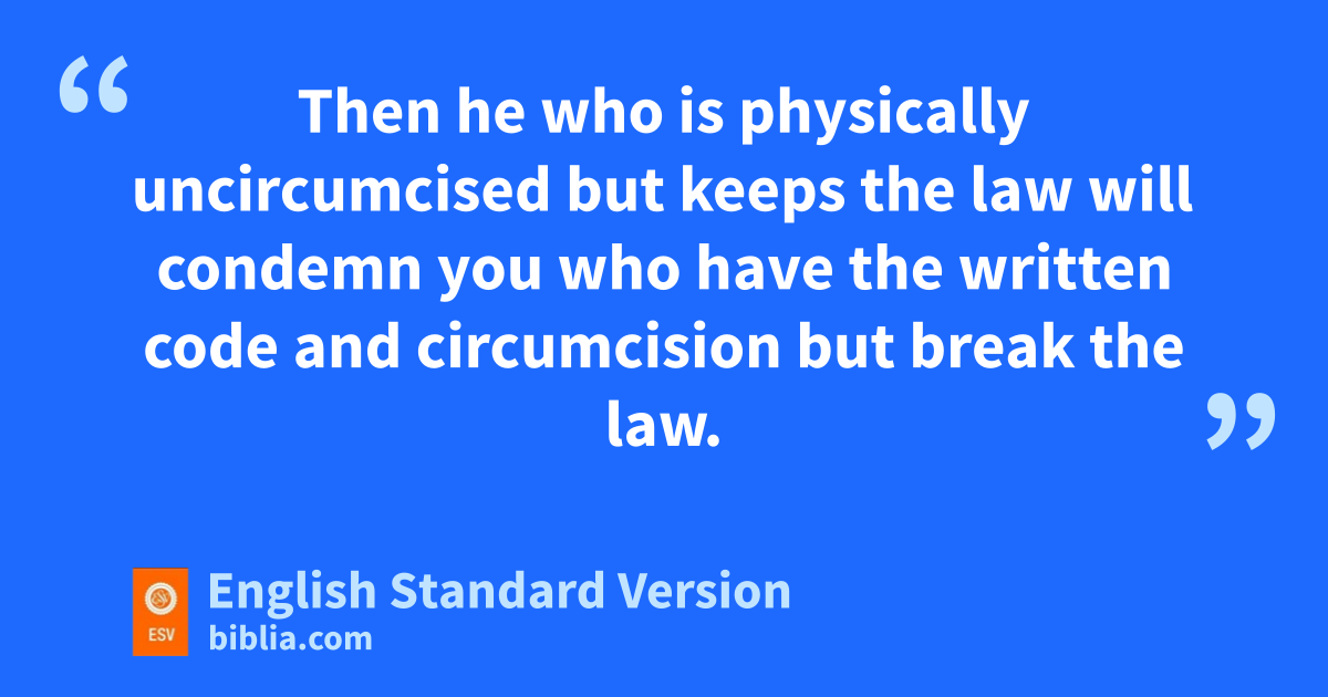 25 For circumcision indeed is of value nif you obey the law, but if you break the law, your circumcision becomes uncircumcision. 26 So, if oa man who is uncircumcised keeps pthe precepts of the law, will not his uncircumcision be regarded2 as circumcision? 27 Then he who is physically3 uncircumcised but keeps the law qwill condemn you who have rthe written code4 and circumcision but break the law. 28 For sno one is a Jew twho is merely one outwardly, nor is circumcision outward and physical. 29 But a Jew is one uinwardly, and vcircumcision is a matter of the heart, by the Spirit, not by the letter. wHis praise is not from man but from God.