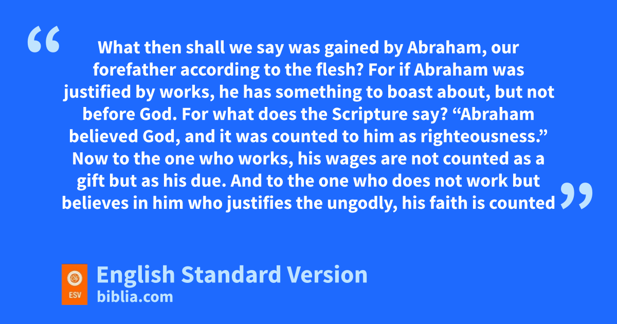 4 What then shall we say was gained by Abraham, tour forefather according to the flesh? 2 For if Abraham was justified by works, he has something to boast about, but unot before God. 3 For what does the Scripture say? v“Abraham believed God, and it was counted to him as righteousness.” 4 Now wto the one who works, his wages are not counted as a gift but as his due. 5 And to the one who does not work but xbelieves in2 him who justifies the ungodly, his faith is counted as righteousness, 6 just as David also speaks of the blessing of the one to whom God counts righteousness apart from works: