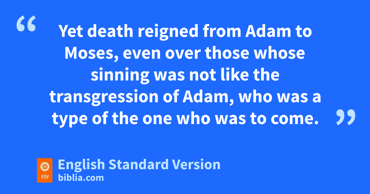 12 Therefore, just as tsin came into the world through one man, and udeath through sin, and vso death spread to all men5 because wall sinned— 13 for sin indeed was in the world before the law was given, but xsin is not counted where there is no law. 14 Yet death reigned from Adam to Moses, even over those whose sinning was not ylike the transgression of Adam, zwho was a type of athe one who was to come.