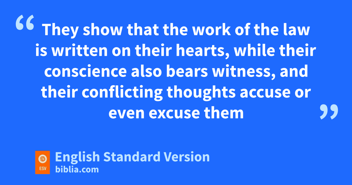 12 For all who have sinned vwithout the law will also perish without the law, and all who have sinned under the law will be judged by the law. 13 For wit is not the hearers of the law who are righteous before God, but the doers of the law who will be justified. 14 For when Gentiles, who do not have the law, xby nature do what the law requires, they are a law to themselves, even though they do not have the law. 15 They show that the work of the law is ywritten on their hearts, while their conscience also bears witness, and their conflicting thoughts accuse or even excuse them 16 zon that day when, aaccording to my gospel, God judges bthe secrets of men cby Christ Jesus.