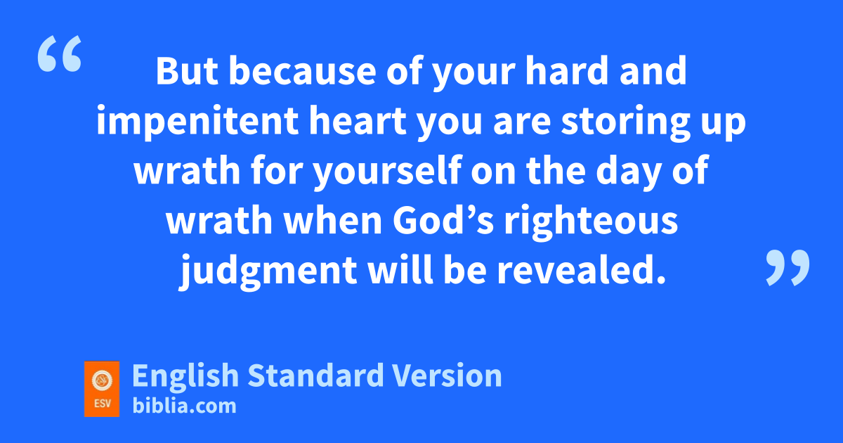2 Therefore you have fno excuse, O man, every one of you who judges. For gin passing judgment on another you condemn yourself, because you, the judge, practice the very same things. 2 We know that the judgment of God rightly falls on those who practice such things. 3 Do you suppose, O man—you who judge those who practice such things and yet do them yourself—that you will escape the judgment of God? 4 Or do you presume on hthe riches of his kindness and iforbearance and jpatience, knot knowing that God’s kindness is meant to lead you to repentance? 5 But because of your hard and impenitent heart you are lstoring up mwrath for yourself on the day of wrath when God’s righteous judgment will be revealed.