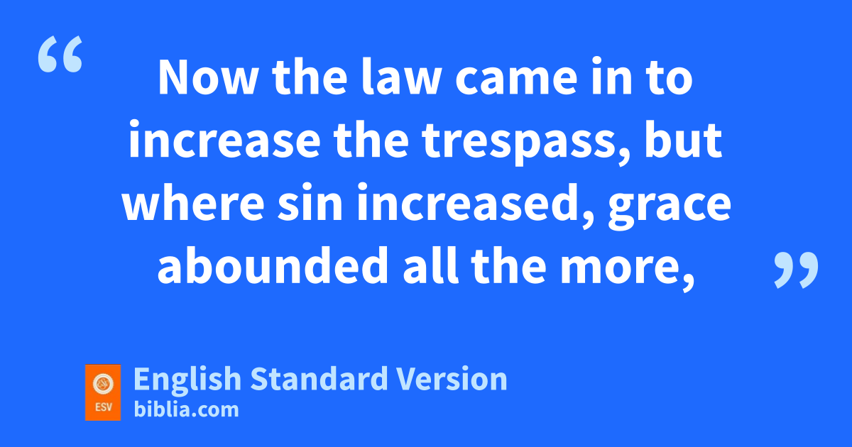 18 Therefore, as one trespass6 led to condemnation for all men, so one act of righteousness7 leads to justification and life for fall men. 19 For as by the one man’s gdisobedience the many were made sinners, so by the one man’s hobedience the many will be made righteous. 20 Now ithe law came in to increase the trespass, but where sin increased, jgrace abounded all the more, 21 so that, kas sin reigned in death, lgrace also might reign through righteousness leading to eternal life through Jesus Christ our Lord.