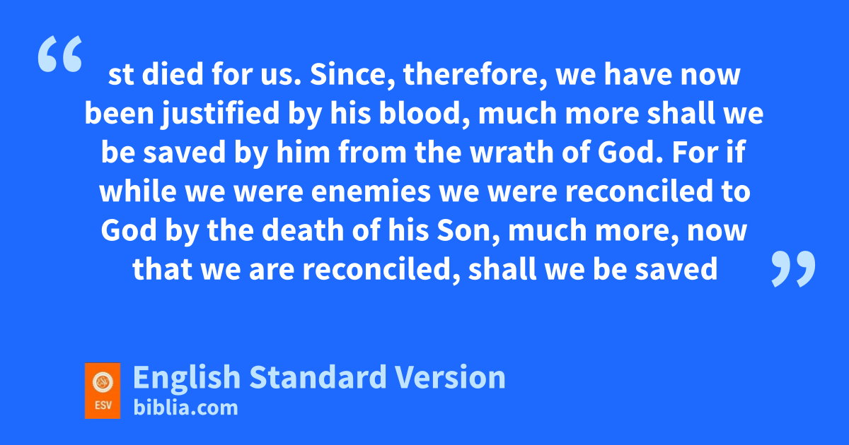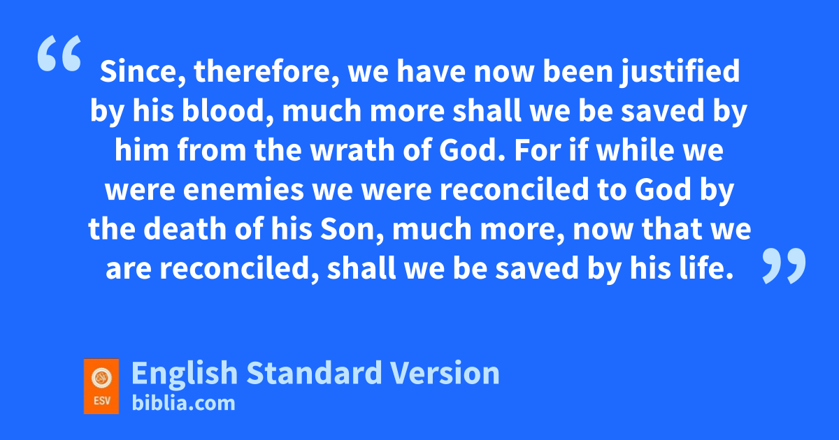 6 For jwhile we were still weak, at the right time kChrist died for the ungodly. 7 For one will scarcely die for a righteous person—though perhaps for a good person one would dare even to die— 8 but lGod shows his love for us in that mwhile we were still sinners, Christ died for us. 9 Since, therefore, nwe have now been justified by his blood, much more shall we be saved by him from othe wrath of God. 10 For if pwhile we were enemies qwe were reconciled to God by the death of his Son, much more, now that we are reconciled, shall we be saved by rhis life. 11 More than that, we also rejoice in God through our Lord Jesus Christ, through whom we have now received sreconciliation.