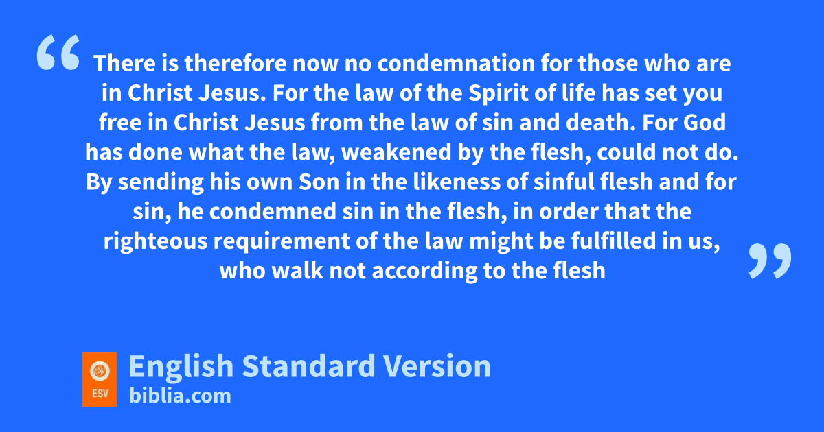 8 There is therefore now no condemnation for those who are in Christ Jesus.1 2 For the law of hthe Spirit of life ihas set you2 free in Christ Jesus from the law of sin and death. 3 For jGod has done what the law, kweakened by the flesh, lcould not do. mBy sending his own Son nin the likeness of sinful flesh and ofor sin,3 he condemned sin in the flesh, 4 in order that pthe righteous requirement of the law might be fulfilled in us, qwho walk not according to the flesh but according to the Spirit. 5 For rthose who live according to the flesh set their minds on sthe things of the flesh, but those who live according to the Spirit set their minds on tthe things of the Spirit. 6 For to set uthe mind on the flesh is death, but to set the mind on the Spirit is life and peace. 7 For the mind that is set on the flesh is vhostile to God, for it does not submit to God’s law; windeed, it cannot. 8 Those who are in the flesh cannot please God.
