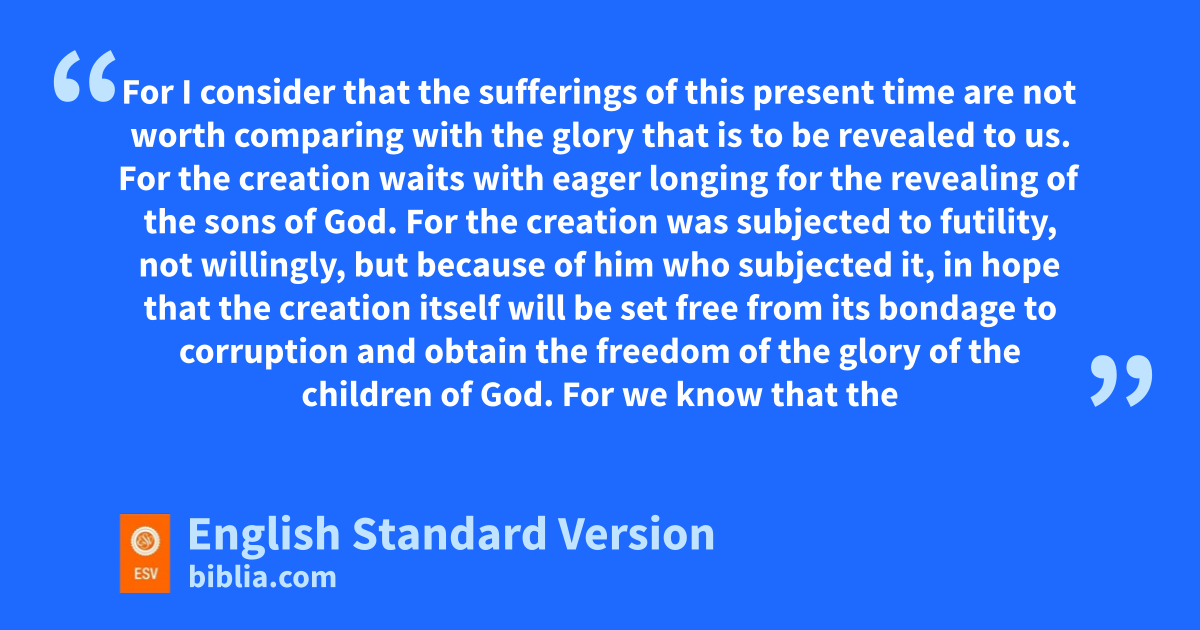 18 For I consider that the sufferings of this present time nare not worth comparing with the glory that is to be revealed to us. 19 For the creation waits with eager longing for othe revealing of the sons of God. 20 For the creation pwas subjected to futility, not willingly, but qbecause of him who subjected it, in hope 21 that rthe creation itself will be set free from its bondage to corruption and obtain the freedom of the glory of the children of God. 22 For we know that sthe whole creation thas been groaning together in the pains of childbirth until now. 23 And not only the creation, but we ourselves, who have uthe firstfruits of the Spirit, vgroan inwardly as wwe wait eagerly for adoption as sons, xthe redemption of our bodies. 24 For yin this hope we were saved. Now zhope that is seen is not hope. For who hopes for what he sees? 25 But if we hope for what we do not see, we await for it with patience.