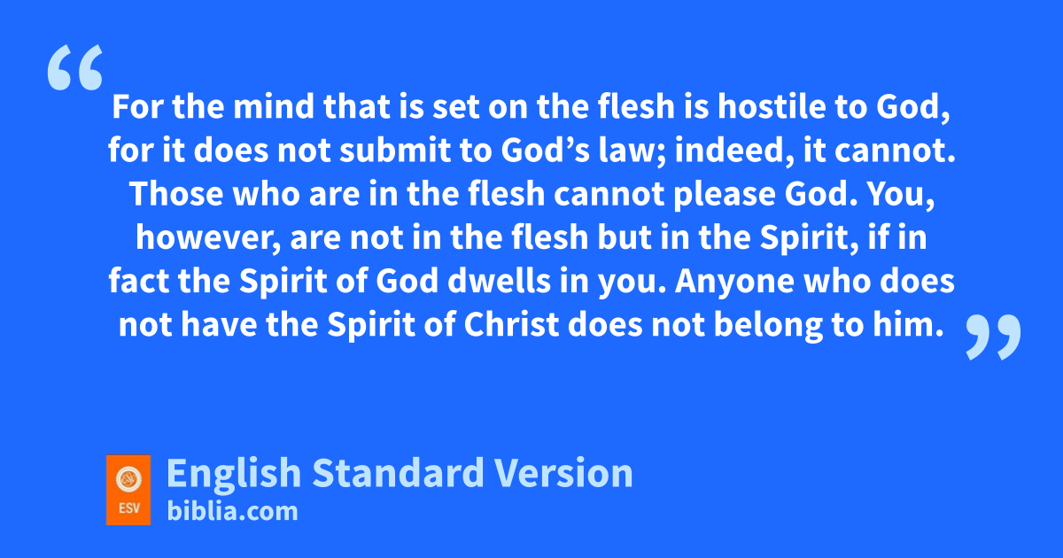 8 There is therefore now no condemnation for those who are in Christ Jesus.1 2 For the law of hthe Spirit of life ihas set you2 free in Christ Jesus from the law of sin and death. 3 For jGod has done what the law, kweakened by the flesh, lcould not do. mBy sending his own Son nin the likeness of sinful flesh and ofor sin,3 he condemned sin in the flesh, 4 in order that pthe righteous requirement of the law might be fulfilled in us, qwho walk not according to the flesh but according to the Spirit. 5 For rthose who live according to the flesh set their minds on sthe things of the flesh, but those who live according to the Spirit set their minds on tthe things of the Spirit. 6 For to set uthe mind on the flesh is death, but to set the mind on the Spirit is life and peace. 7 For the mind that is set on the flesh is vhostile to God, for it does not submit to God’s law; windeed, it cannot. 8 Those who are in the flesh cannot please God.