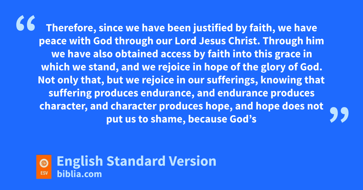 5 aTherefore, since we have been justified by faith, bwe1 have peace with God through our Lord Jesus Christ. 2 Through him we have also cobtained access by faith2 into this grace din which we stand, and ewe3 rejoice4 in hope of the glory of God. 3 Not only that, but we frejoice in our sufferings, knowing that suffering gproduces endurance, 4 and endurance produces character, and character produces hope, 5 and hhope does not put us to shame, because God’s love ihas been poured into our hearts through the Holy Spirit who has been given to us.