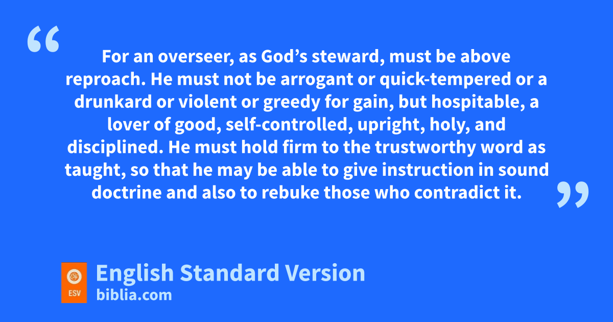 5 oThis is why I left you in Crete, so that you might put what remained into order, and pappoint elders in every town as I directed you— 6 qif anyone is above reproach, the husband of one wife,4 and his children are believers5 and not open to the charge of rdebauchery or insubordination. 7 For an overseer,6 sas God’s steward, must be above reproach. He must not tbe arrogant or quick-tempered or a drunkard or violent uor greedy for gain, 8 but hospitable, a lover of good, self-controlled, upright, holy, vand disciplined. 9 He must whold firm to the trustworthy word as taught, so that he may be able to give instruction in xsound7 doctrine and also to rebuke those who contradict it.