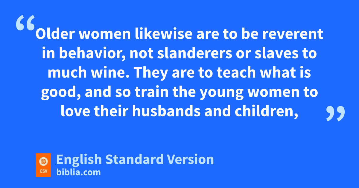 2 But as for you, teach what accords with psound1 doctrine. 2 Older men are to be sober-minded, dignified, self-controlled, psound in faith, in love, and in steadfastness. 3 qOlder women likewise are to be reverent in behavior, rnot slanderers sor slaves to much wine. They are to teach what is good, 4 and so train the young women to love their husbands and children, 5 to be self-controlled, tpure, uworking at home, kind, and vsubmissive to their own husbands, wthat the word of God may not be reviled. 6 Likewise, urge xthe younger men to be self-controlled. 7 Show yourself in all respects to be ya model of good works, and in your teaching zshow integrity, adignity, 8 and bsound speech that cannot be condemned, cso that an opponent may be put to shame, having nothing evil to say about us. 9 dBondservants2 are to be submissive to their own masters ein everything; they are to be well-pleasing, not argumentative, 10 not pilfering, fbut showing all good faith, gso that in everything they may adorn the doctrine of God our Savior.