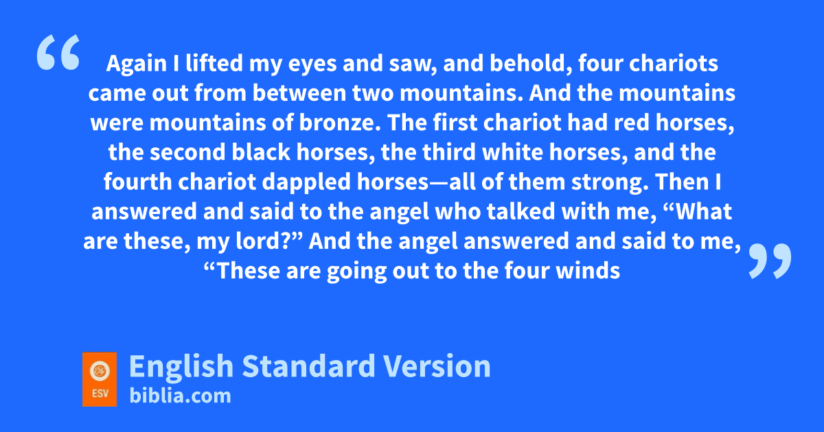 6 Again I lifted my eyes and saw, and behold, four chariots came out from between two mountains. And the mountains were mountains of mbronze. 2 The first chariot had nred horses, the second oblack horses, 3 the third pwhite horses, and the fourth chariot dappled horses—all of them strong.1 4 Then I answered and said to qthe angel who talked with me, “What are these, my lord?” 5 And the angel answered and said to me, r“These are going out to the four winds of heaven,2 after spresenting themselves before tthe Lord of all the earth. 6 The chariot with the black horses goes toward uthe north country, the white ones go after them, and the dappled ones go toward vthe south country.” 7 When the strong horses came out, they were impatient to go and wpatrol the earth. And he said, “Go, wpatrol the earth.” wSo they patrolled the earth. 8 Then he cried to me, “Behold, those who go toward uthe north country have set my Spirit at rest in uthe north country.”
