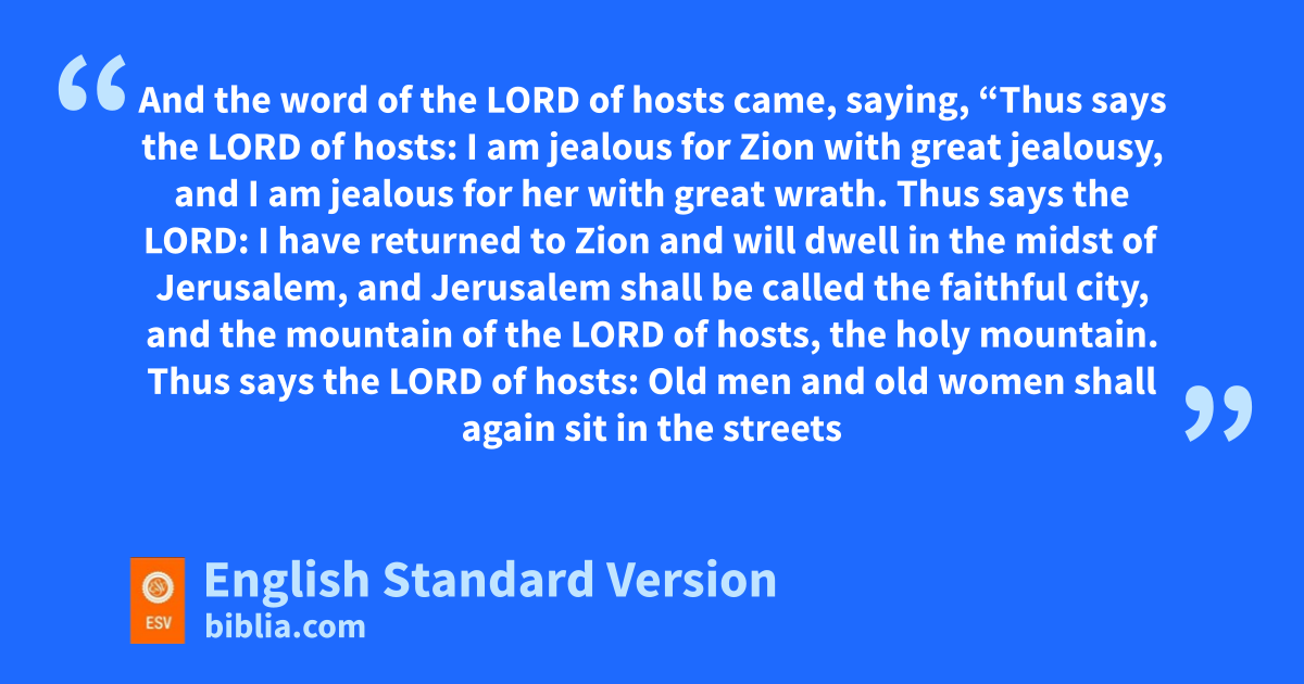 8 And the word of the Lord of hosts came, saying, 2 “Thus says the Lord of hosts: sI am jealous for Zion with great jealousy, and I am jealous for her with great wrath. 3 Thus says the Lord: tI have returned to Zion and uwill dwell in the midst of Jerusalem, vand Jerusalem shall be called the faithful city, wand the mountain of the Lord of hosts, the holy mountain. 4 Thus says the Lord of hosts: xOld men and old women shall again sit in the streets of Jerusalem, each with staff in hand because of great age. 5 And the streets of the city shall be full of boys and girls playing in its streets. 6 Thus says the Lord of hosts: yIf it is marvelous in the sight of the remnant of this people in those days, zshould it also be marvelous in my sight, declares the Lord of hosts? 7 Thus says the Lord of hosts: Behold, aI will save my people bfrom the east country and from the west country, 8 and I will bring them to dwell in the midst of Jerusalem. cAnd they shall be my people, and I will be their God, din faithfulness and in righteousness.”