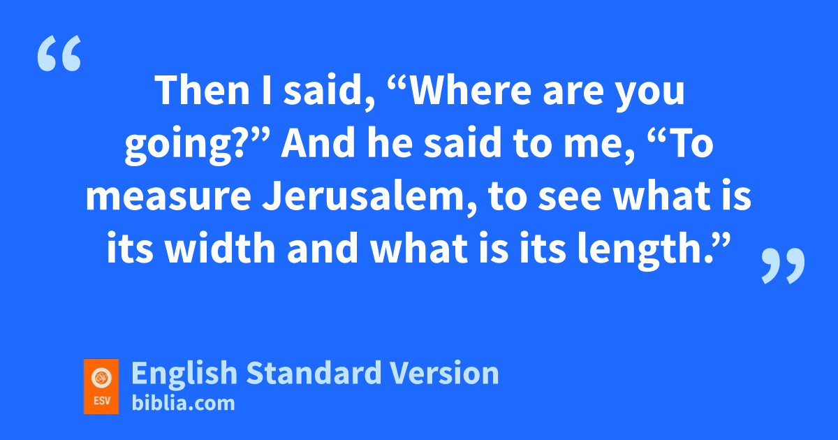 2 1 And I lifted my eyes and saw, and behold, oa man with a measuring line in his hand! 2 Then I said, “Where are you going?” And he said to me, p“To measure Jerusalem, to see what is its width and what is its length.” 3 And behold, qthe angel who talked with me came forward, and another angel came forward to meet him 4 and said to him, “Run, say to that young man, r‘Jerusalem shall be inhabited sas villages without walls, because of tthe multitude of people and livestock in it. 5 And I will be to her ua wall of fire all around, declares the Lord, and I will be the glory in her midst.’ ”