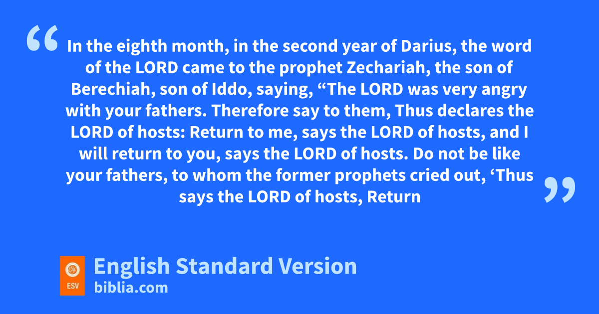1 In the eighth month, ain the second year of Darius, the word of the Lord came to the prophet bZechariah, the son of cBerechiah, son of dIddo, saying, 2 e“The Lord was very angry with your fathers. 3 Therefore say to them, Thus declares the Lord of hosts: fReturn to me, says the Lord of hosts, and gI will return to you, says the Lord of hosts. 4 hDo not be like your fathers, ito whom the former prophets cried out, ‘Thus says the Lord of hosts, fReturn from your evil ways and from your evil deeds.’ But jthey did not hear or pay attention to me, declares the Lord. 5 Your fathers, where are they? And kthe prophets, do they live forever? 6 lBut my words and my statutes, which I commanded mmy servants the prophets, did they not novertake your fathers? So they repented and said, o‘As the Lord of hosts purposed to deal with us for pour ways and pdeeds, so has he dealt with us.’ ”
