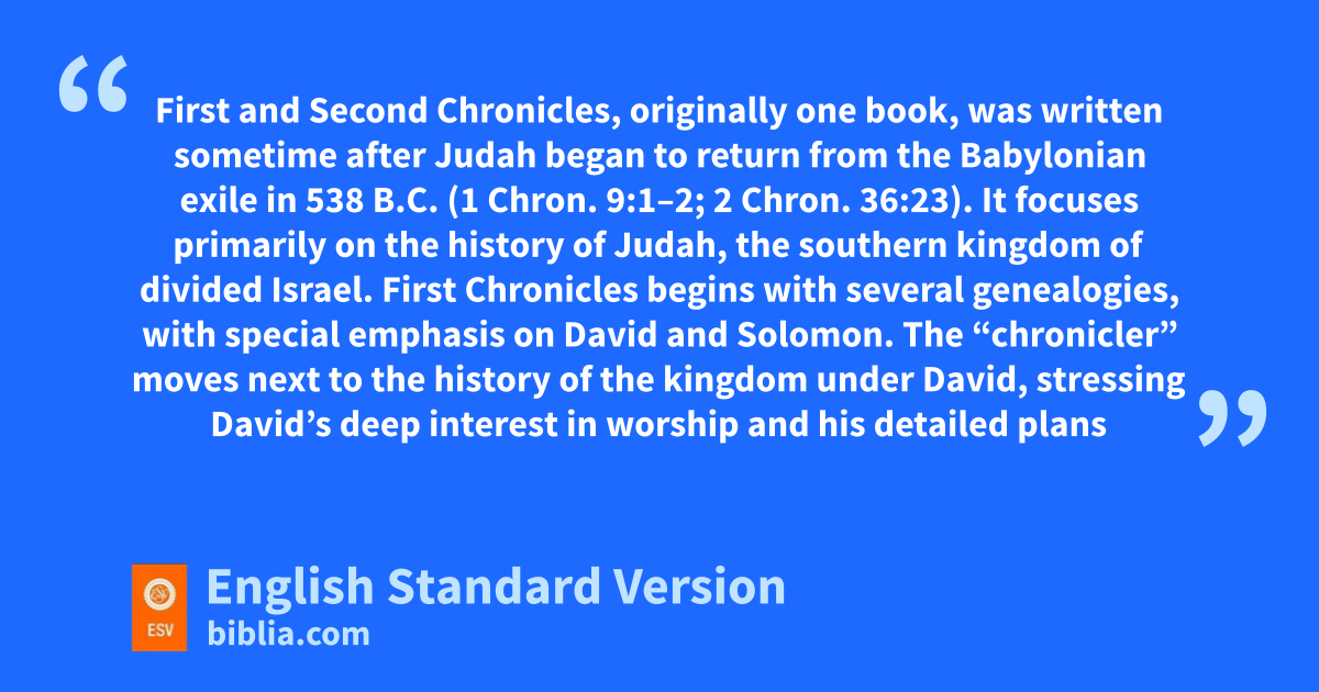 First and Second Chronicles, originally one book, was written sometime after Judah began to return from the Babylonian exile in 538 b.c. (1 Chron. 9:1–2; 2 Chron. 36:23). It focuses primarily on the history of Judah, the southern kingdom of divided Israel. First Chronicles begins with several genealogies, with special emphasis on David and Solomon. The “chronicler” moves next to the history of the kingdom under David, stressing David’s deep interest in worship and his detailed plans for the construction of the temple—which would be built by his son Solomon. First Chronicles was probably written to reassure the returned exiles of God’s faithfulness toward his people. Its author is unknown, although many have thought that Ezra was the principal writer.