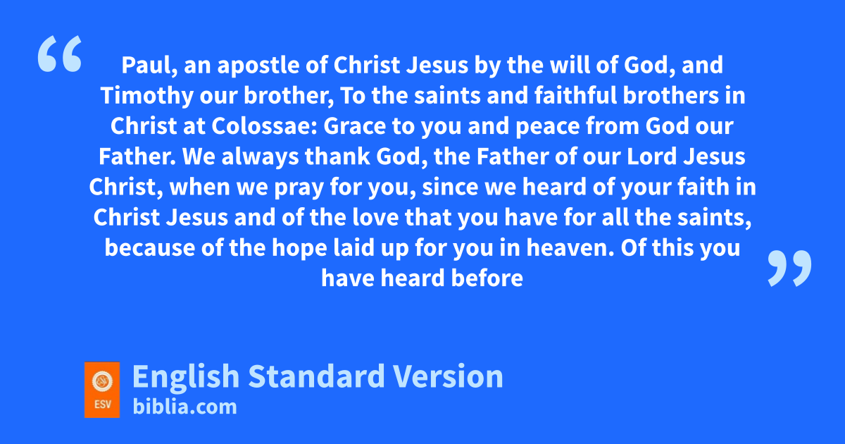 3 fWe always thank God, the Father of our Lord Jesus Christ, when we pray for you, 4 since we heard of gyour faith in Christ Jesus and of gthe love that you have for all the saints, 5 because of hthe hope ilaid up for you in heaven. Of this you have heard before in jthe word of the truth, the gospel, 6 which has come to you, as indeed kin the whole world it is lbearing fruit and increasing—as it also does among you, since the day you mheard it and understood nthe grace of God in truth, 7 just as you learned it from oEpaphras our beloved pfellow servant.2 He is pa faithful minister of Christ on your3 behalf 8 and has made known to us your qlove in the Spirit.