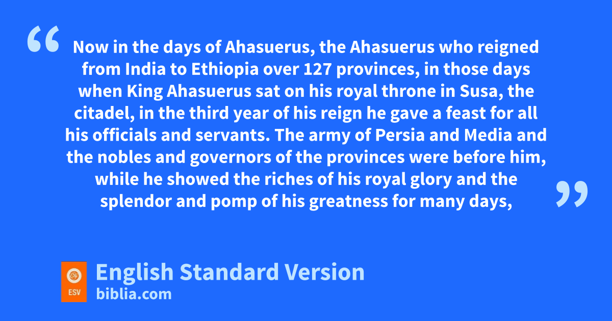1 Now in the days of Ahasuerus, the Ahasuerus who reigned afrom India to Ethiopia over b127 provinces, 2 in those days when King Ahasuerus csat on his royal throne in dSusa, the citadel, 3 in the third year of his reign ehe gave a feast for all his officials and servants. The army of Persia and Media and the nobles and governors of the provinces were before him, 4 while he showed the riches of his royal glory and the splendor and pomp of his greatness for many days, 180 days. 5 And when these days were completed, the king gave for all the people present in Susa the citadel, both great and small, a feast lasting for seven days in the court of fthe garden of the king’s palace. 6 There were white cotton curtains and violet hangings fastened with cords of fine linen and purple to silver rods1 and marble pillars, and also gcouches of gold and silver on a mosaic pavement of porphyry, marble, mother-of-pearl, and precious stones. 7 Drinks were served in golden vessels, vessels of different kinds, and the royal wine was lavished according to the bounty of the king. 8 And drinking was according to this edict: “There is no compulsion.” For the king had given orders to all the staff of his palace to do as each man desired. 9 Queen Vashti also gave a feast for the women in the palace that belonged to King Ahasuerus.