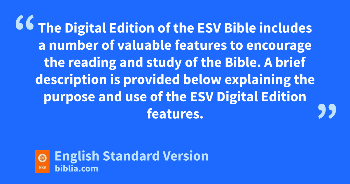 The Digital Edition of the ESV Bible includes a number of valuable features to encourage the reading and study of the Bible. A brief description is provided below explaining the purpose and use of the ESV Digital Edition features.