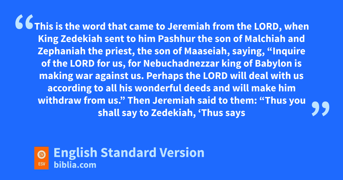 21 This is the word that came to Jeremiah from the Lord, when King Zedekiah sent to him uPashhur the son of Malchiah and vZephaniah the priest, the son of wMaaseiah, saying, 2 x“Inquire of the Lord for us, yfor Nebuchadnezzar1 king of Babylon is making war against us. Perhaps the Lord will deal with us according to zall his wonderful deeds and will make him withdraw from us.”