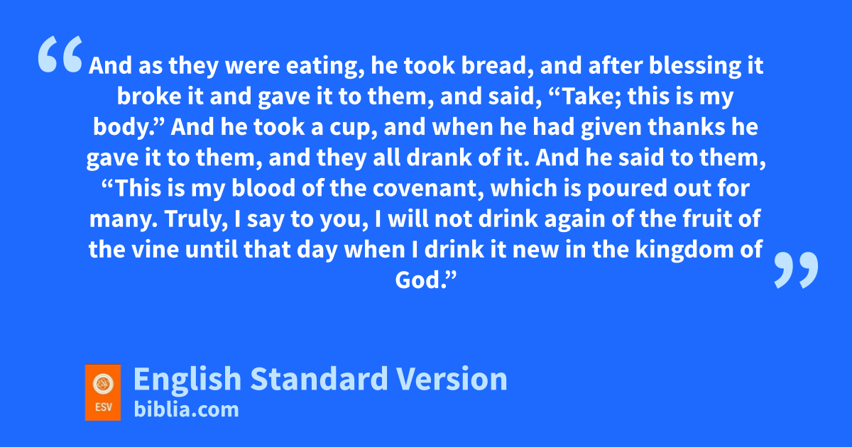 22 dAnd as they were eating, he took bread, and after eblessing it broke it and gave it to them, and said, “Take; fthis is my body.” 23 And he took a cup, and when he had ggiven thanks he gave it to them, and they all drank of it. 24 And he said to them, f“This is my hblood of the3 covenant, which is poured out for imany. 25 Truly, I say to you, I will not drink again of the fruit of the vine until that day when I drink it new in the kingdom of God.”