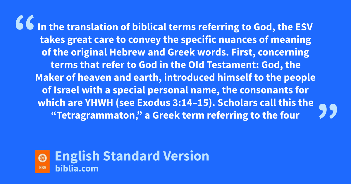 In the translation of biblical terms referring to God, the ESV takes great care to convey the specific nuances of meaning of the original Hebrew and Greek words. First, concerning terms that refer to God in the Old Testament: God, the Maker of heaven and earth, introduced himself to the people of Israel with a special personal name, the consonants for which are YHWH (see Exodus 3:14–15). Scholars call this the “Tetragrammaton,” a Greek term referring to the four Hebrew letters YHWH. The exact pronunciation of YHWH is uncertain, because the Jewish people considered the personal name of God to be so holy that it should never be spoken aloud. Instead of reading the word YHWH, therefore, they would normally read the Hebrew word ’adonay (“Lord”), and the ancient translations into Greek, Syriac, and Aramaic also followed this practice. When the vowels of the word ’adonay are placed with the consonants of YHWH, this results in the familiar word Jehovah that was used in some earlier English Bible translations. As is common among English translations today, the ESV usually renders the personal name of God (YHWH) by the word Lord (printed in small capitals). An exception to this is when the Hebrew word ’adonay appears together with YHWH, in which case the two words are rendered together as “the Lord [in lowercase] God [in small capitals].” In contrast to the personal name for God (YHWH), the more general name for God in Old Testament Hebrew is ’elohim and its related forms of ’el or ’eloah, all of which are normally translated “God” (in lowercase letters). The use of these different ways to translate the Hebrew words for God is especially beneficial to English readers, enabling them to see and understand the different ways that the personal name and the general name for God are both used to refer to the One True God of the Old Testament.