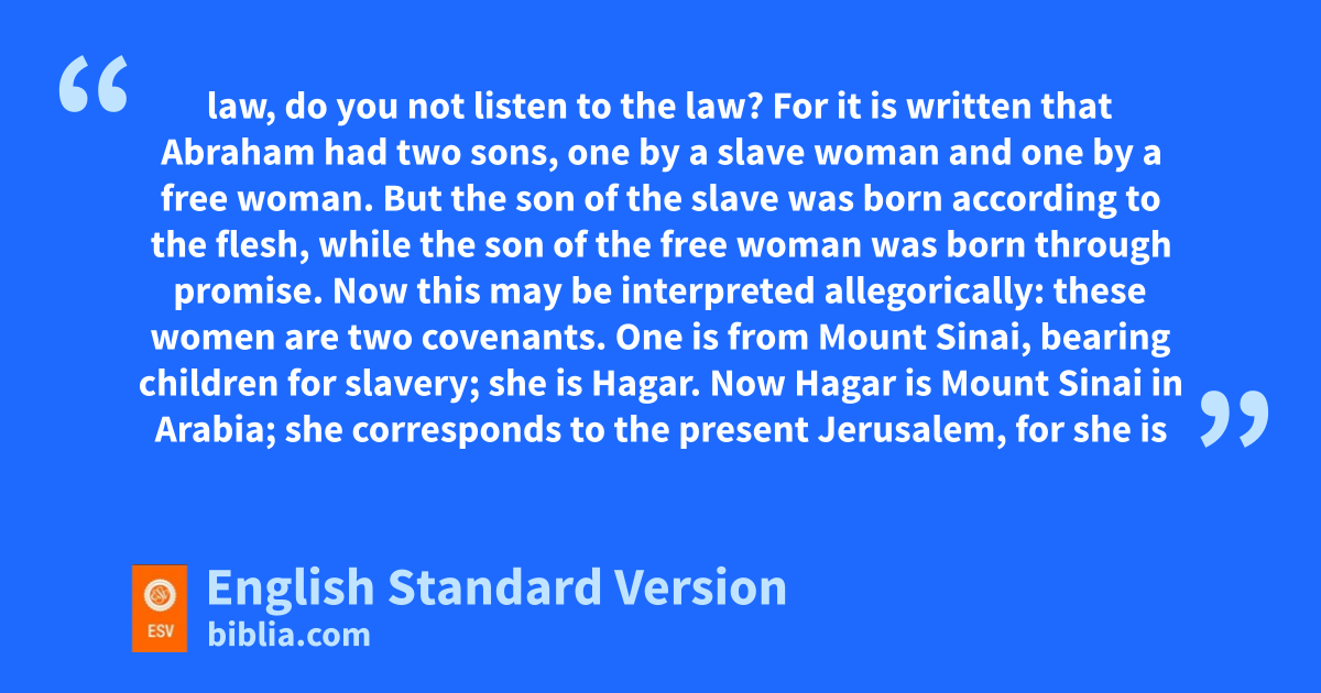21 Tell me, you who desire to be under the law, do you not listen to the law? 22 For it is written that Abraham had two sons, eone by a slave woman and fone by a free woman. 23 But gthe son of the slave was born according to the flesh, while hthe son of the free woman was born through promise. 24 Now this may be interpreted allegorically: these women are two icovenants. jOne is from Mount Sinai, bearing children for slavery; she is Hagar. 25 Now Hagar is Mount Sinai in Arabia;5 she corresponds to the present Jerusalem, for she is in slavery with her children. 26 But kthe Jerusalem above is free, and she is our mother. 27 For it is written,