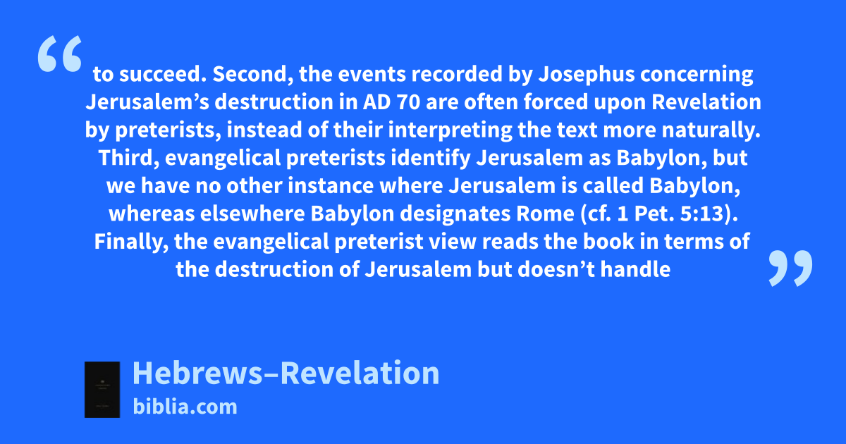 to succeed. Second, the events recorded by Josephus concerning Jerusalem’s destruction in AD 70 are often forced upon Revelation by preterists, instead of their interpreting the text more naturally. Third, evangelical preterists identify Jerusalem as Babylon, but we have no other instance where Jerusalem is called Babylon, whereas elsewhere Babylon designates Rome (cf. 1 Pet. 5:13). Finally, the evangelical preterist view reads the book in terms of the destruction of Jerusalem but doesn’t handle