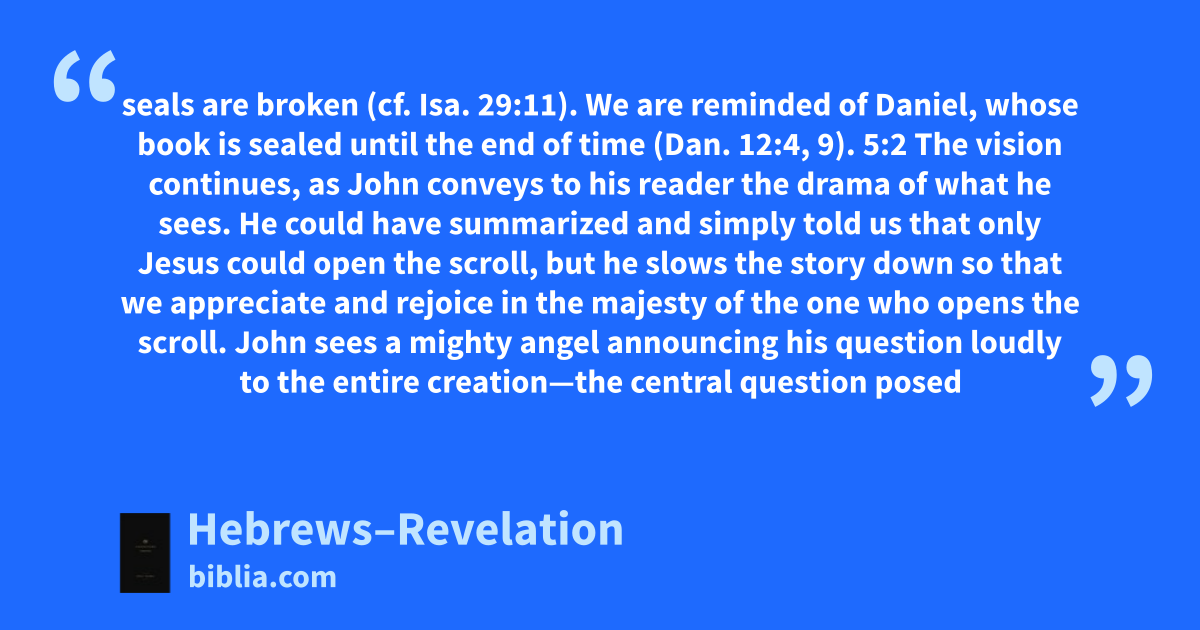 seals are broken (cf. Isa. 29:11). We are reminded of Daniel, whose book is sealed until the end of time (Dan. 12:4, 9). 5:2 The vision continues, as John conveys to his reader the drama of what he sees. He could have summarized and simply told us that only Jesus could open the scroll, but he slows the story down so that we appreciate and rejoice in the majesty of the one who opens the scroll. John sees a mighty angel announcing his question loudly to the entire creation—the central question posed