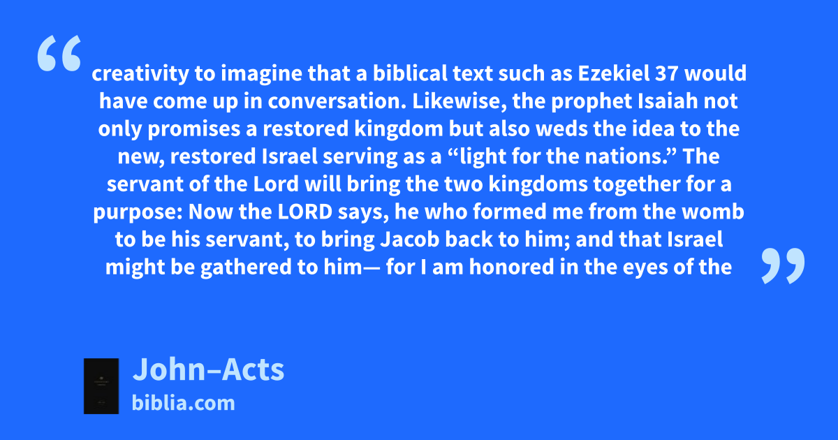 creativity to imagine that a biblical text such as Ezekiel 37 would have come up in conversation. Likewise, the prophet Isaiah not only promises a restored kingdom but also weds the idea to the new, restored Israel serving as a “light for the nations.” The servant of the Lord will bring the two kingdoms together for a purpose: Now the LORD says, he who formed me from the womb to be his servant, to bring Jacob back to him; and that Israel might be gathered to him— for I am honored in the eyes of the