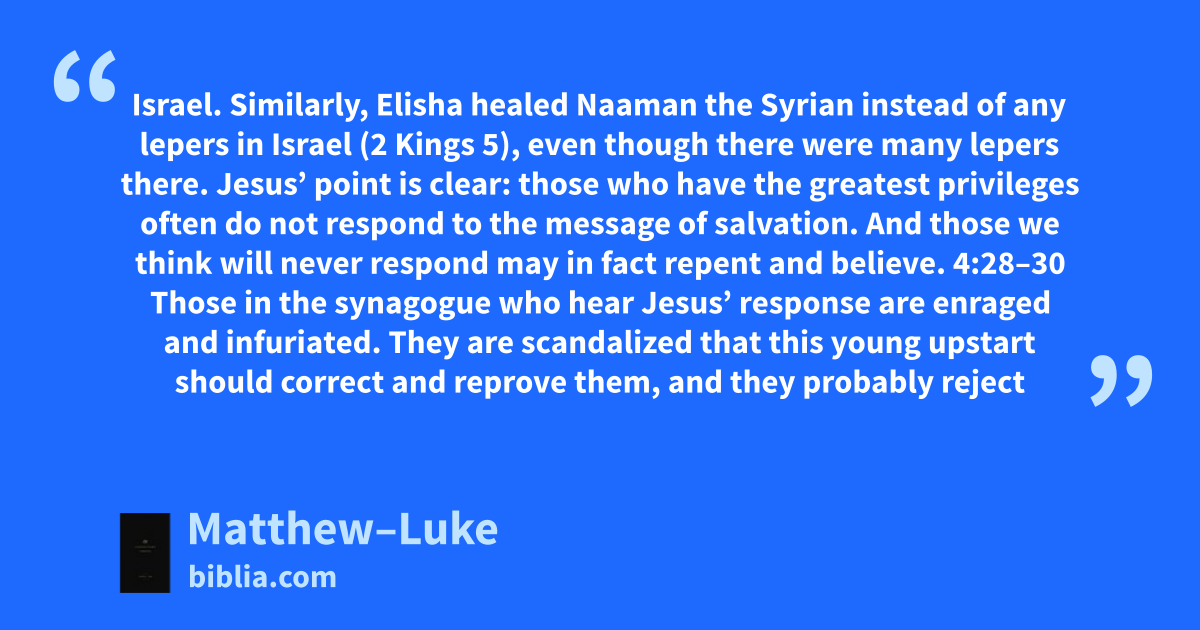 Israel. Similarly, Elisha healed Naaman the Syrian instead of any lepers in Israel (2 Kings 5), even though there were many lepers there. Jesus’ point is clear: those who have the greatest privileges often do not respond to the message of salvation. And those we think will never respond may in fact repent and believe. 4:28–30 Those in the synagogue who hear Jesus’ response are enraged and infuriated. They are scandalized that this young upstart should correct and reprove them, and they probably reject