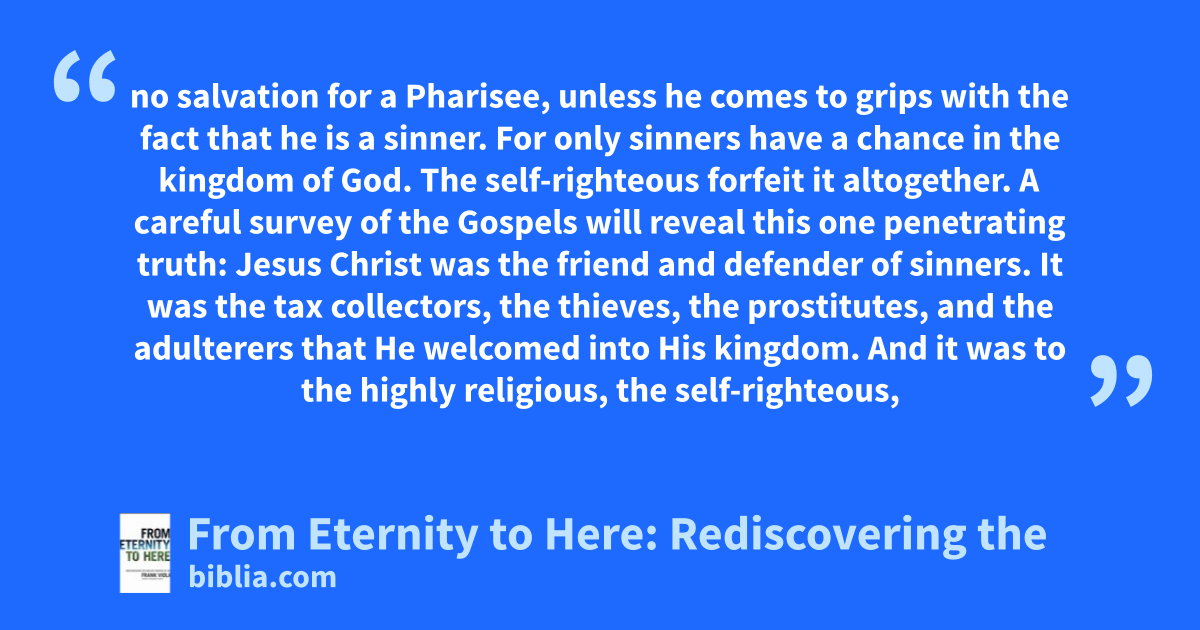 no salvation for a Pharisee, unless he comes to grips with the fact that he is a sinner. For only sinners have a chance in the kingdom of God. The self-righteous forfeit it altogether. A careful survey of the Gospels will reveal this one penetrating truth: Jesus Christ was the friend and defender of sinners. It was the tax collectors, the thieves, the prostitutes, and the adulterers that He welcomed into His kingdom. And it was to the highly religious, the self-righteous,
