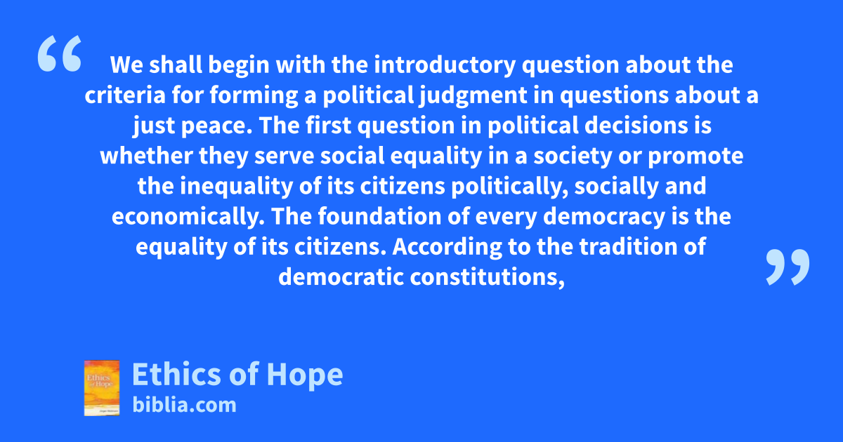 We shall begin with the introductory question about the criteria for forming a political judgment in questions about a just peace. The first question in political decisions is whether they serve social equality in a society or promote the inequality of its citizens politically, socially and economically. The foundation of every democracy is the equality of its citizens. According to the tradition of democratic constitutions,