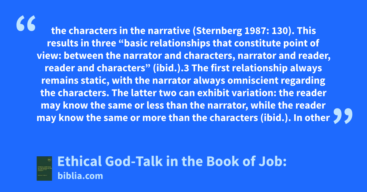 the characters in the narrative (Sternberg 1987: 130). This results in three “basic relationships that constitute point of view: between the narrator and characters, narrator and reader, reader and characters” (ibid.).3 The first relationship always remains static, with the narrator always omniscient regarding the characters. The latter two can exhibit variation: the reader may know the same or less than the narrator, while the reader may know the same or more than the characters (ibid.). In other