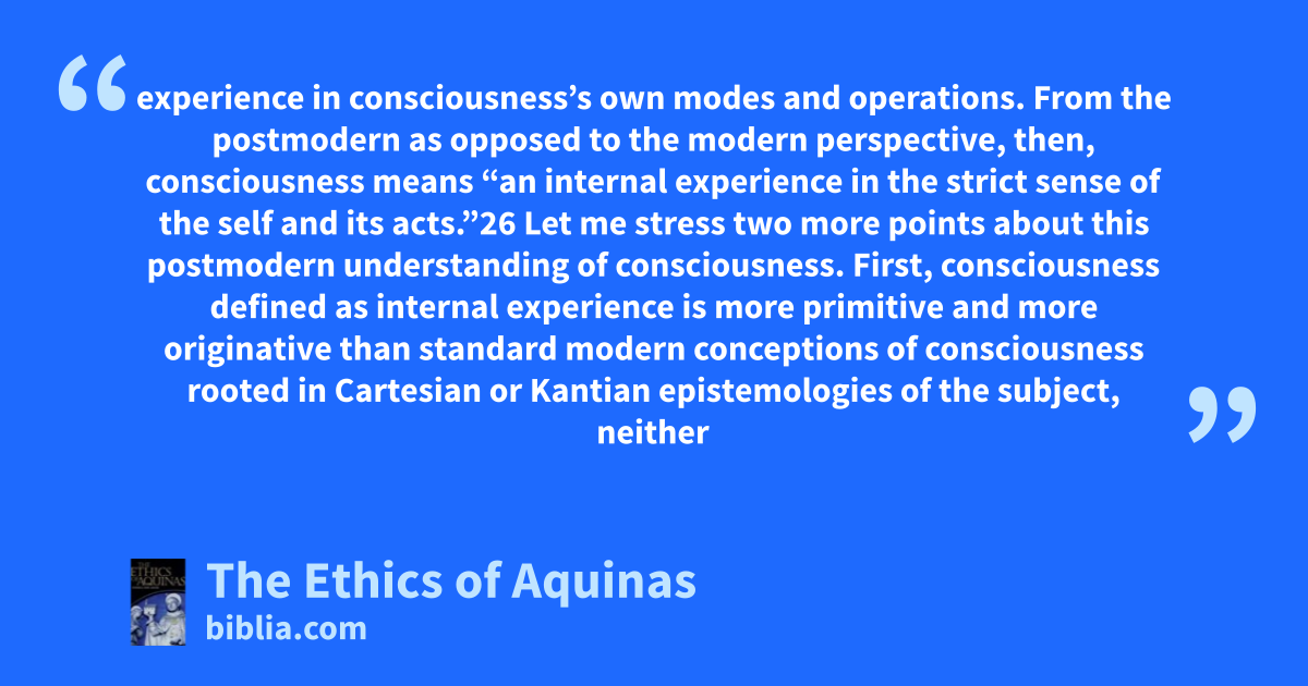 experience in consciousness’s own modes and operations. From the postmodern as opposed to the modern perspective, then, consciousness means “an internal experience in the strict sense of the self and its acts.”26 Let me stress two more points about this postmodern understanding of consciousness. First, consciousness defined as internal experience is more primitive and more originative than standard modern conceptions of consciousness rooted in Cartesian or Kantian epistemologies of the subject, neither
