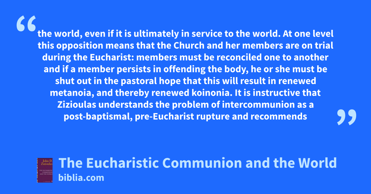 the world, even if it is ultimately in service to the world. At one level this opposition means that the Church and her members are on trial during the Eucharist: members must be reconciled one to another and if a member persists in offending the body, he or she must be shut out in the pastoral hope that this will result in renewed metanoia, and thereby renewed koinonia. It is instructive that Zizioulas understands the problem of intercommunion as a post-baptismal, pre-Eucharist rupture and recommends