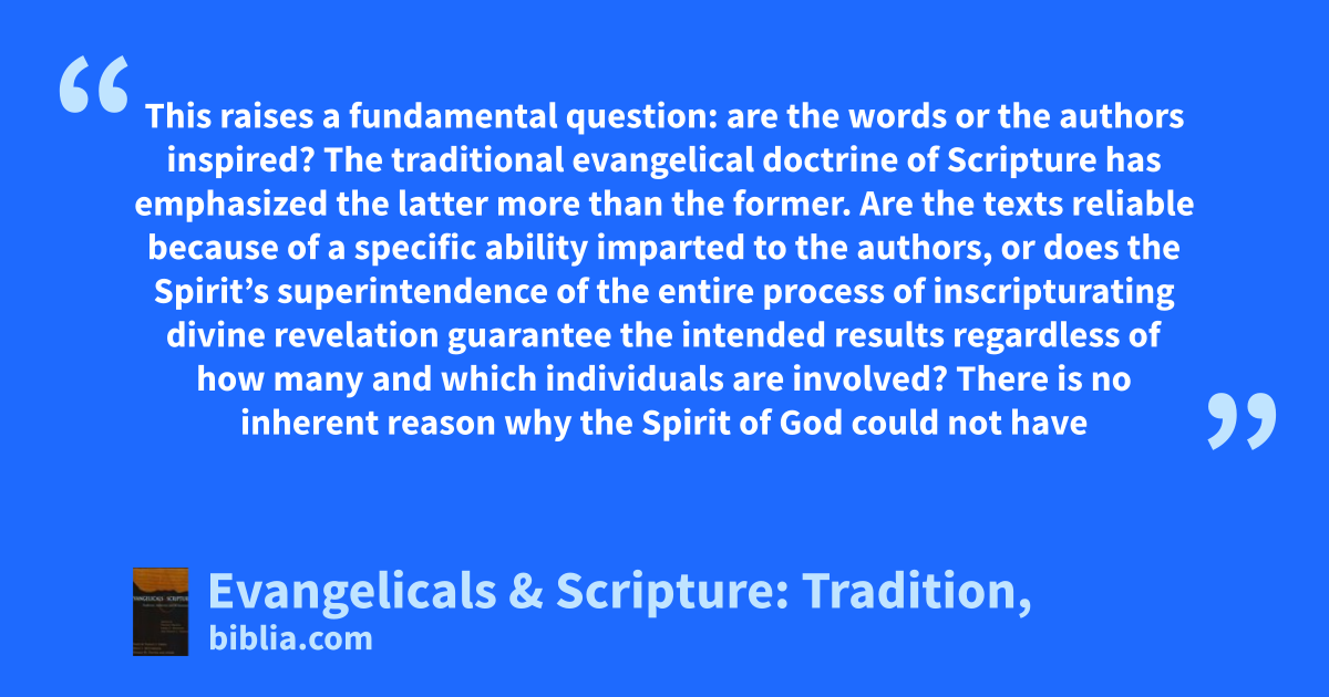 This raises a fundamental question: are the words or the authors inspired? The traditional evangelical doctrine of Scripture has emphasized the latter more than the former. Are the texts reliable because of a specific ability imparted to the authors, or does the Spirit’s superintendence of the entire process of inscripturating divine revelation guarantee the intended results regardless of how many and which individuals are involved? There is no inherent reason why the Spirit of God could not have