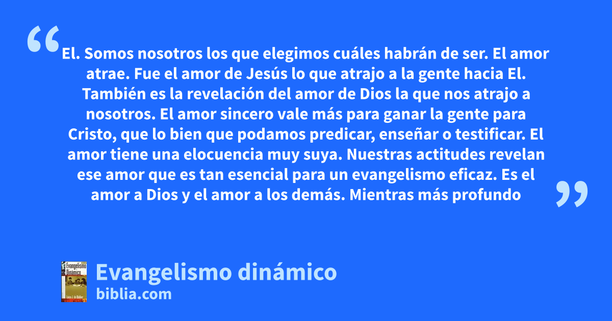 El. Somos nosotros los que elegimos cuáles habrán de ser. El amor atrae. Fue el amor de Jesús lo que atrajo a la gente hacia El. También es la revelación del amor de Dios la que nos atrajo a nosotros. El amor sincero vale más para ganar la gente para Cristo, que lo bien que podamos predicar, enseñar o testificar. El amor tiene una elocuencia muy suya. Nuestras actitudes revelan ese amor que es tan esencial para un evangelismo eficaz. Es el amor a Dios y el amor a los demás. Mientras más profundo