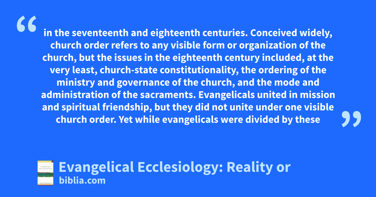 in the seventeenth and eighteenth centuries. Conceived widely, church order refers to any visible form or organization of the church, but the issues in the eighteenth century included, at the very least, church-state constitutionality, the ordering of the ministry and governance of the church, and the mode and administration of the sacraments. Evangelicals united in mission and spiritual friendship, but they did not unite under one visible church order. Yet while evangelicals were divided by these