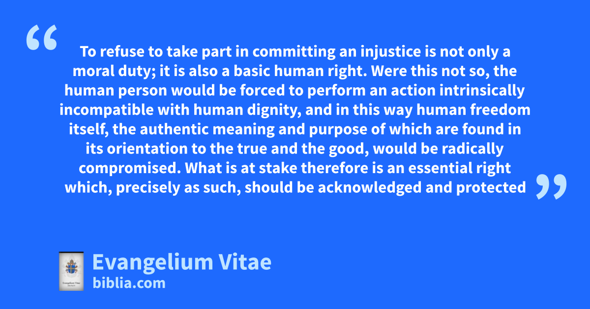 To refuse to take part in committing an injustice is not only a moral duty; it is also a basic human right. Were this not so, the human person would be forced to perform an action intrinsically incompatible with human dignity, and in this way human freedom itself, the authentic meaning and purpose of which are found in its orientation to the true and the good, would be radically compromised. What is at stake therefore is an essential right which, precisely as such, should be acknowledged and protected