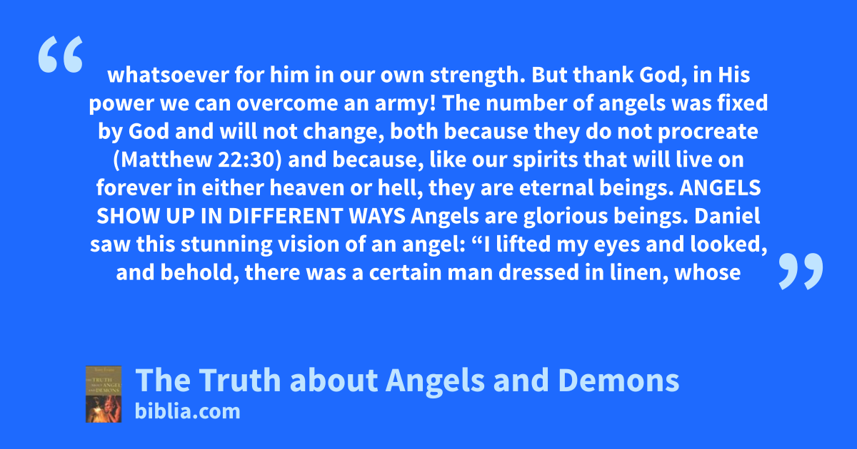 whatsoever for him in our own strength. But thank God, in His power we can overcome an army! The number of angels was fixed by God and will not change, both because they do not procreate (Matthew 22:30) and because, like our spirits that will live on forever in either heaven or hell, they are eternal beings. ANGELS SHOW UP IN DIFFERENT WAYS Angels are glorious beings. Daniel saw this stunning vision of an angel: “I lifted my eyes and looked, and behold, there was a certain man dressed in linen, whose