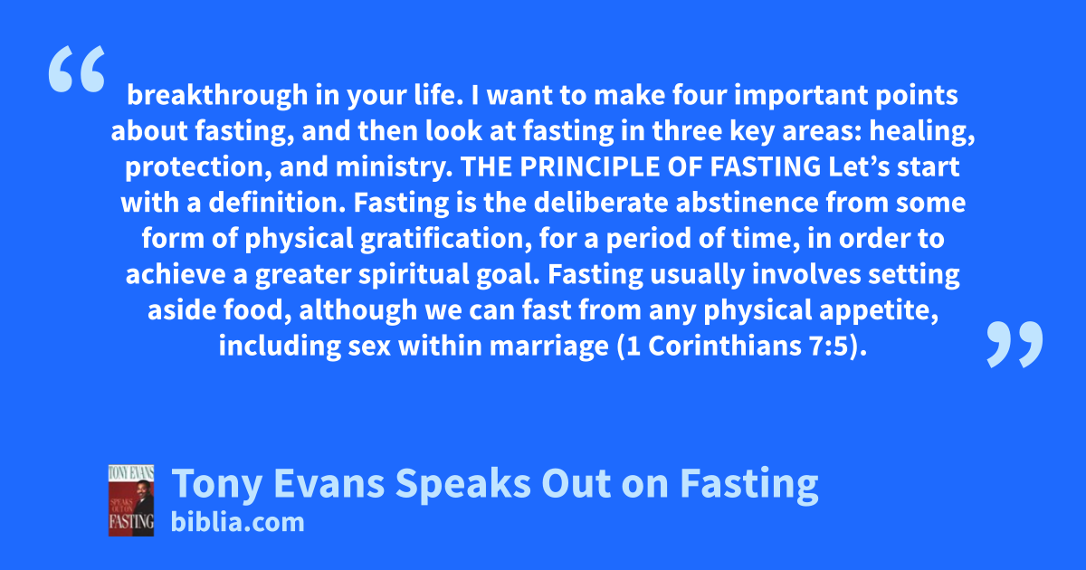 breakthrough in your life. I want to make four important points about fasting, and then look at fasting in three key areas: healing, protection, and ministry. THE PRINCIPLE OF FASTING Let’s start with a definition. Fasting is the deliberate abstinence from some form of physical gratification, for a period of time, in order to achieve a greater spiritual goal. Fasting usually involves setting aside food, although we can fast from any physical appetite, including sex within marriage (1 Corinthians 7:5).