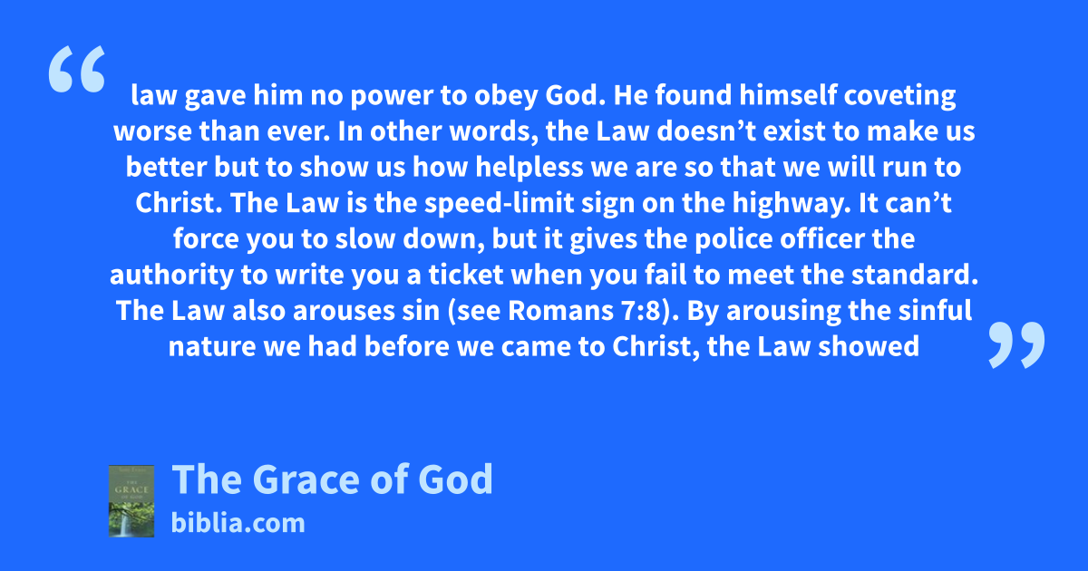 law gave him no power to obey God. He found himself coveting worse than ever. In other words, the Law doesn’t exist to make us better but to show us how helpless we are so that we will run to Christ. The Law is the speed-limit sign on the highway. It can’t force you to slow down, but it gives the police officer the authority to write you a ticket when you fail to meet the standard. The Law also arouses sin (see Romans 7:8). By arousing the sinful nature we had before we came to Christ, the Law showed