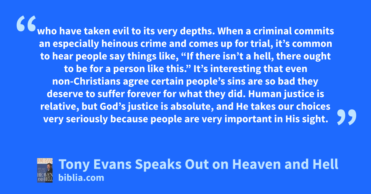 who have taken evil to its very depths. When a criminal commits an especially heinous crime and comes up for trial, it’s common to hear people say things like, “If there isn’t a hell, there ought to be for a person like this.” It’s interesting that even non-Christians agree certain people’s sins are so bad they deserve to suffer forever for what they did. Human justice is relative, but God’s justice is absolute, and He takes our choices very seriously because people are very important in His sight.
