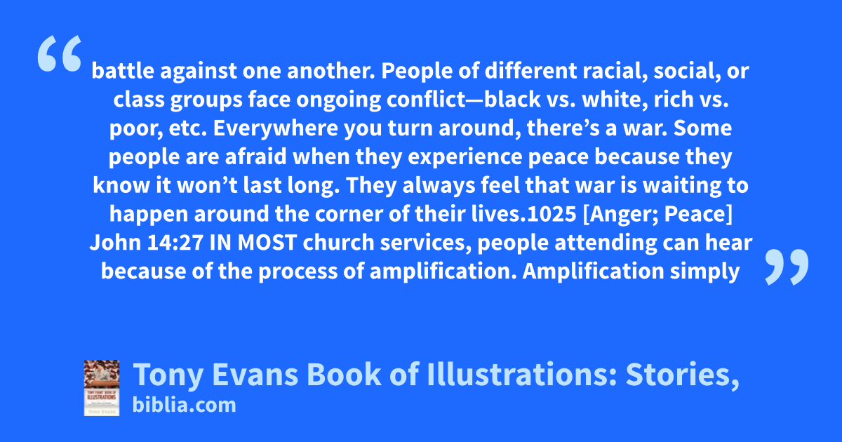 battle against one another. People of different racial, social, or class groups face ongoing conflict—black vs. white, rich vs. poor, etc. Everywhere you turn around, there’s a war. Some people are afraid when they experience peace because they know it won’t last long. They always feel that war is waiting to happen around the corner of their lives.1025 [Anger; Peace] John 14:27 IN MOST church services, people attending can hear because of the process of amplification. Amplification simply