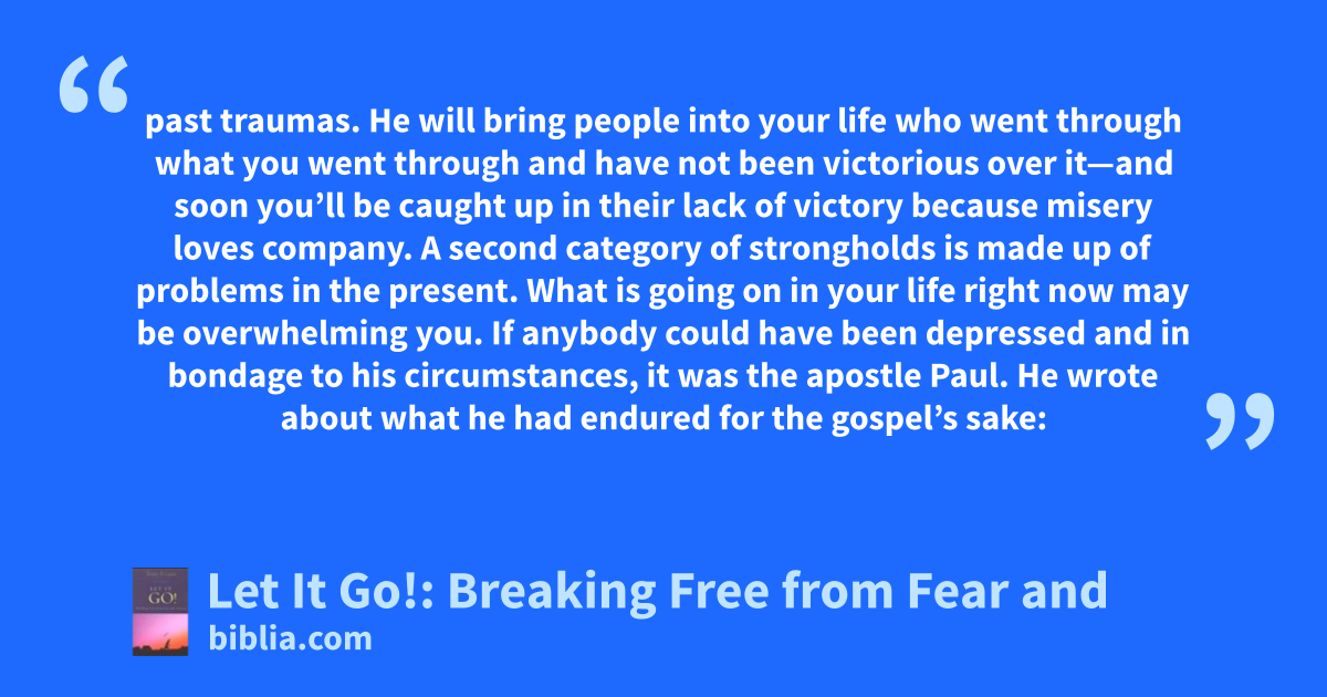 past traumas. He will bring people into your life who went through what you went through and have not been victorious over it—and soon you’ll be caught up in their lack of victory because misery loves company. A second category of strongholds is made up of problems in the present. What is going on in your life right now may be overwhelming you. If anybody could have been depressed and in bondage to his circumstances, it was the apostle Paul. He wrote about what he had endured for the gospel’s sake: