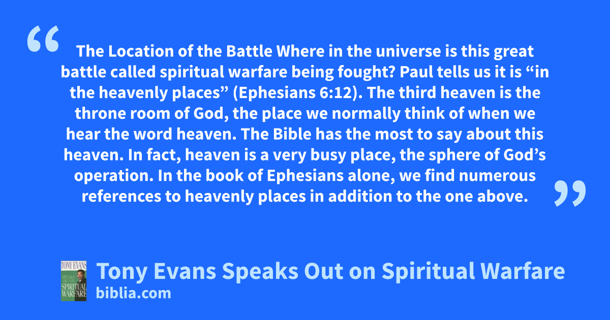 The Location of the Battle Where in the universe is this great battle called spiritual warfare being fought? Paul tells us it is “in the heavenly places” (Ephesians 6:12). The third heaven is the throne room of God, the place we normally think of when we hear the word heaven. The Bible has the most to say about this heaven. In fact, heaven is a very busy place, the sphere of God’s operation. In the book of Ephesians alone, we find numerous references to heavenly places in addition to the one above.