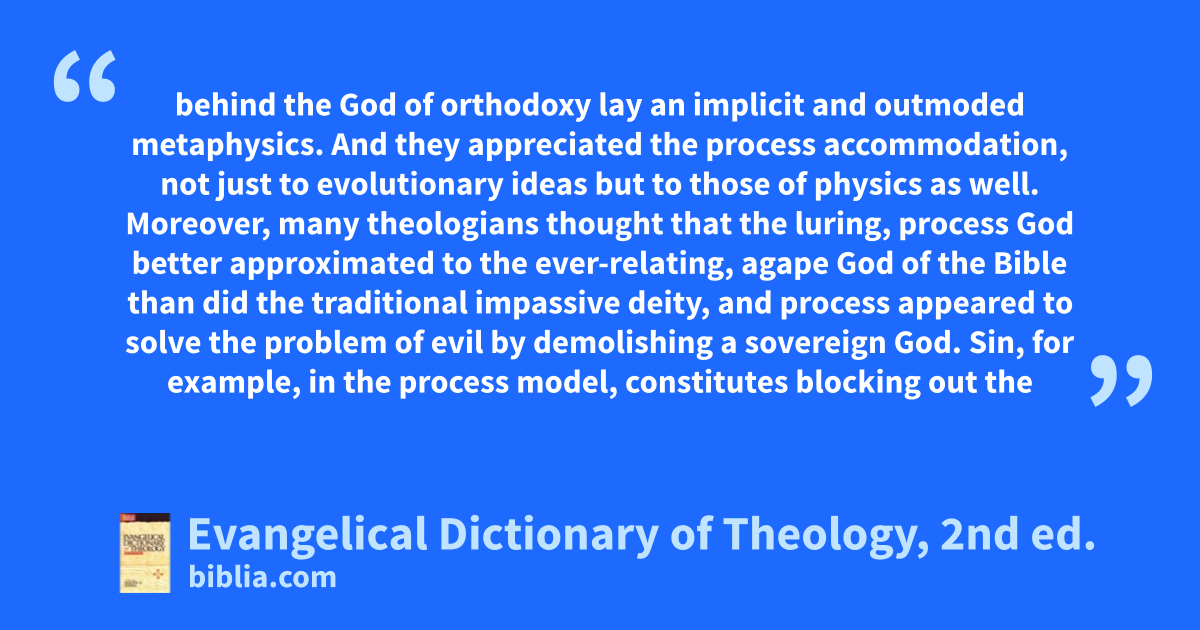 behind the God of orthodoxy lay an implicit and outmoded metaphysics. And they appreciated the process accommodation, not just to evolutionary ideas but to those of physics as well. Moreover, many theologians thought that the luring, process God better approximated to the ever-relating, agape God of the Bible than did the traditional impassive deity, and process appeared to solve the problem of evil by demolishing a sovereign God. Sin, for example, in the process model, constitutes blocking out the