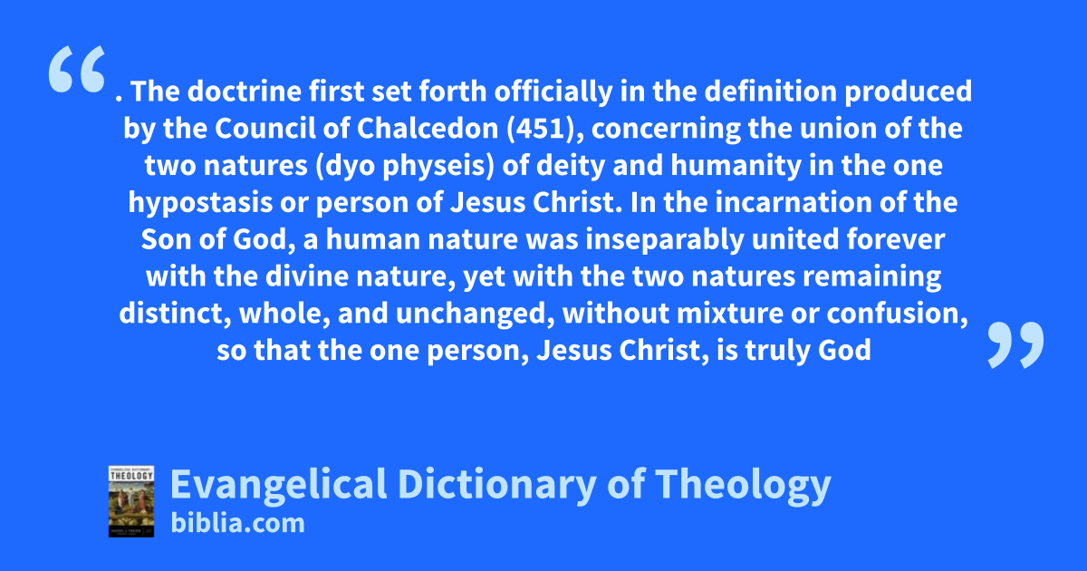 . The doctrine first set forth officially in the definition produced by the Council of Chalcedon (451), concerning the union of the two natures (dyo physeis) of deity and humanity in the one hypostasis or person of Jesus Christ. In the incarnation of the Son of God, a human nature was inseparably united forever with the divine nature, yet with the two natures remaining distinct, whole, and unchanged, without mixture or confusion, so that the one person, Jesus Christ, is truly God