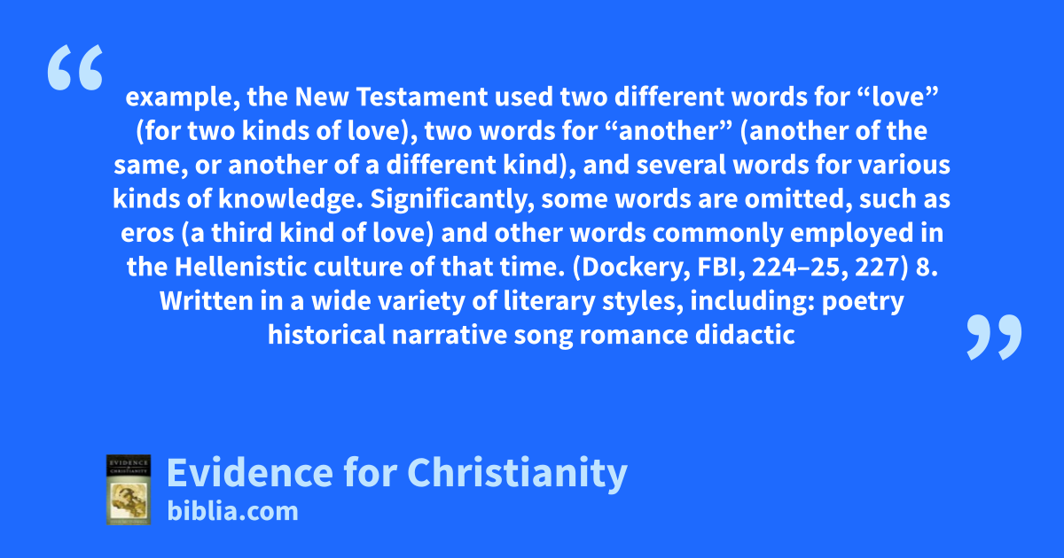 example, the New Testament used two different words for “love” (for two kinds of love), two words for “another” (another of the same, or another of a different kind), and several words for various kinds of knowledge. Significantly, some words are omitted, such as eros (a third kind of love) and other words commonly employed in the Hellenistic culture of that time. (Dockery, FBI, 224–25, 227) 8. Written in a wide variety of literary styles, including: poetry historical narrative song romance didactic